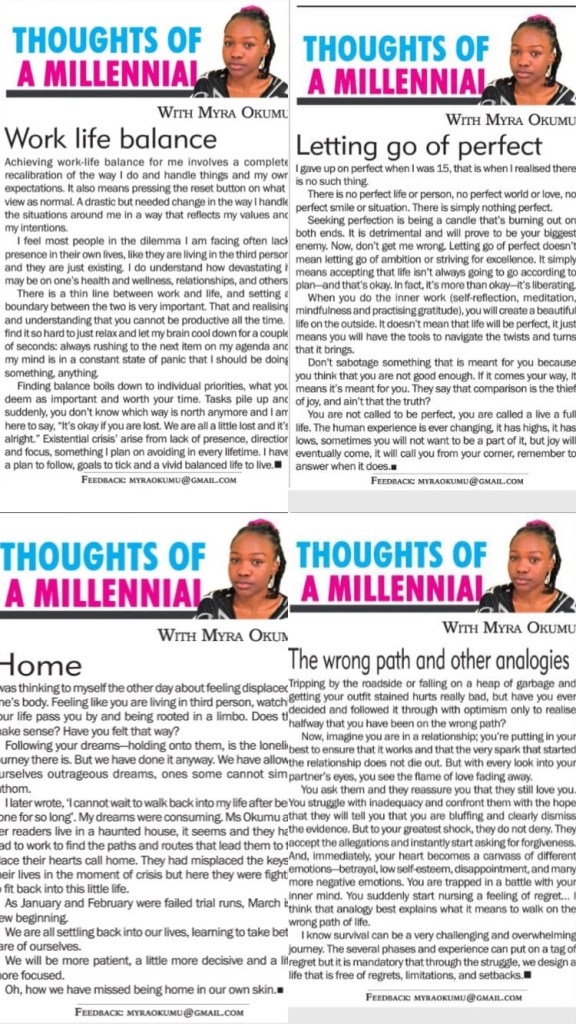 I continue to write for the weekend Nation as a fake millennial (I am Gen Z). I still enjoy showering people with my unsolicited advice and receiving feedback from my loyal and beautiful readers. I always want to hear from you guys because I grow with each comment. My email is ready to receive your comments, questions, queries, etc.