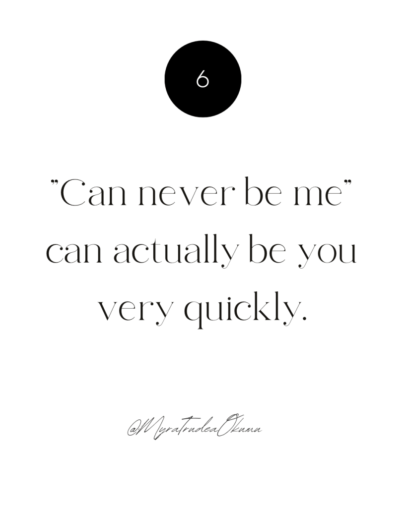 Those mistakes you see others making, those decisions you deem irresponsible, those things you see as irrelevant and you think, “I would never.” Or “Could never be me.” Sweetheart, it could be you before you close your eyes and open them. You would be nevering like never before.
