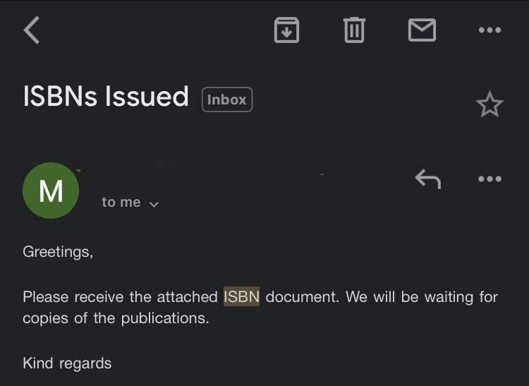 Fortunately, I was able to locate them in Zomba and I got my 3 ISBNs at less than $7 and the condition that I send them copies.